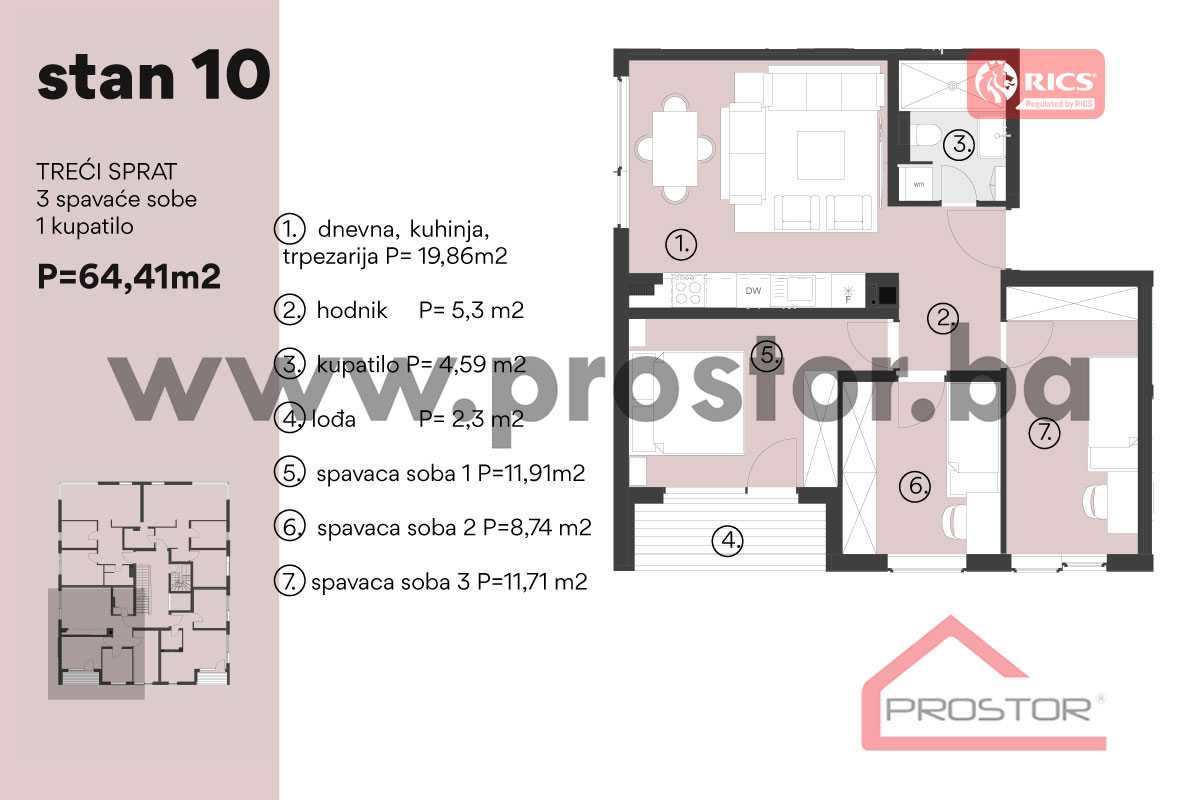 SADRŽAJ Dnevni boravak sa kuhinjom i trpezarijom, tri spavaće sobe, kupatilo, hodnik i lođa.